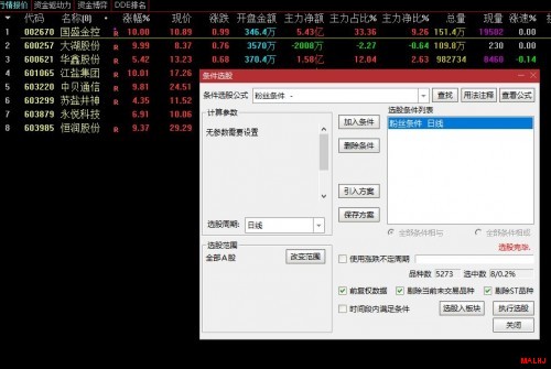 分时伏击条件预警公式原码:分时伏击条件预警公式原码: C>DYNAINFO(3)*1.035 AND V/REF(V,1)>0.35 AND NOT(CODELIKE('5')) AND NOT(CODELIKE('8')) AND NOT(CODELIKE('4')) AND NOT(NAMELIKE('S')) AND NOT(NAMELIKE('*')) AND FINANCE(1)/100000000<25 AND FINANCE(7)/100000000<20 AND FINANCE(1)/100000000*C<300 AND C>MA(C,20) AND MA(C,20)>MA(C,60) AND MA(C,60)>MA(C,120) AND MA(V,5)>MA(V,20) AND MA(V,20)>MA(V,60) AND (HY_INDEXC/HY_INDEXO-1)*100>1 {板块领涨} AND (HY_INDEXC/HY_INDEXO-1)*100>(INDEXC/INDEXO-1)*100{强于大盘} ; 效果图: 图片:6.JPG 粉丝修改后的分时伏击源码:(未作认何变动) C>REF(C,1)*1.035 AND V/REF(V,1)>0.35 {上面这两句是最主要,开盘后涨幅大于3.5%,并且量能也放大0.35倍预警,涨幅太大有可能买不进,量能也相应放大表明当前个股活跃} AND O>=REF(C,1)*1 AND O>REF(C,1) {这两句是裸K形态,开盘价大于等于昨天收盘价且昨天收阳阳线裸K形态,当然可以改自己喜欢的形态,上穿类或双响炮类形态等} AND CEILING(INTPART(V>MA(V,30))) AND MA(V,5)>MA(V,34){这两句是成交量多头形态,可以改自己喜欢的形态} AND C>MA(C,10) AND MA(C,10)>MA(C,20) AND MA(C,20)>MA(C,60){这两句是均线多头形态,可以改自己喜欢的形态} AND NOT(CODELIKE('688')) AND NOT(CODELIKE('8')) AND NOT(CODELIKE('4')) AND NOT(CODELIKE('3')) AND NOT(NAMELIKE('S')) AND NOT(NAMELIKE('*')){这六句是去688,8,4,3开头股票代码和ST,停牌,自己可以买哪种开头股票代码,自己删对应的行码} AND FINANCE(1)/100000000*C<300;{这句是选择流通市值小于300亿,也可以加入自己喜欢的} {只做盘中9:30~10:30预警用,不当盘前盘后选股用,设置完条件,盘中满足条件就自动跳出个股决策,盘前或盘后选股,是条件发生之后意义不大} {就是这么简单,别把事情弄得太复杂,加入自己喜欢的各类形态就可以100%战胜任何提示指标} 效果图: 图片:5.JPG 公式直接下载: |
