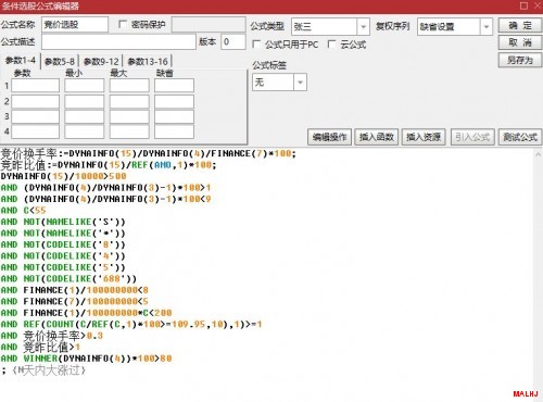 竞昨比值:=DYNAINFO(15)/REF(AMO,1)*100; DYNAINFO(15)/10000>500 AND (DYNAINFO(4)/DYNAINFO(3)-1)*100>1 AND (DYNAINFO(4)/DYNAINFO(3)-1)*100<9 AND C<55 AND NOT(NAMELIKE('S')) AND NOT(NAMELIKE('*')) AND NOT(CODELIKE('8')) AND NOT(CODELIKE('4')) AND NOT(CODELIKE('5')) AND NOT(CODELIKE('688')) AND FINANCE(1)/100000000<8 AND FINANCE(7)/100000000<5 AND FINANCE(1)/100000000*C<200 AND REF(COUNT(C/REF(C,1)*100>=109.95,10),1)>=1 AND 竞价换手率>0.3 AND 竞昨比值>1 AND WINNER(DYNAINFO(4))*100>80 ; {N天内大涨过}; |